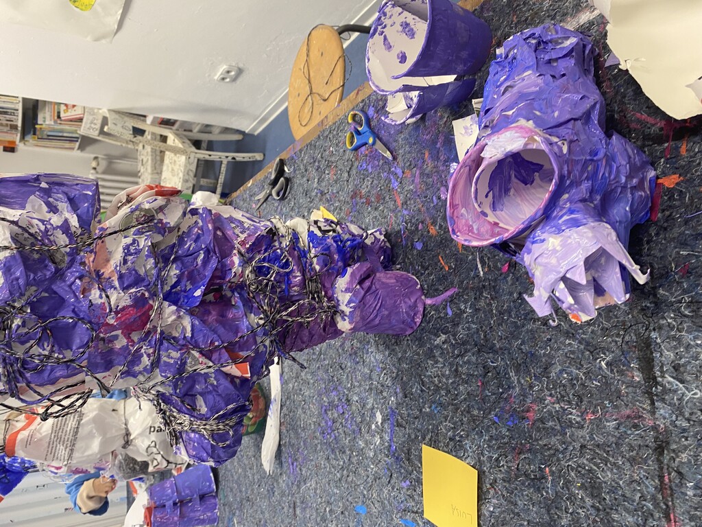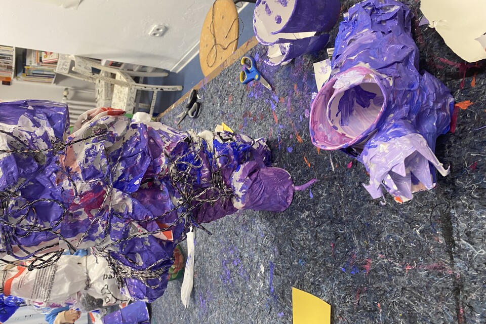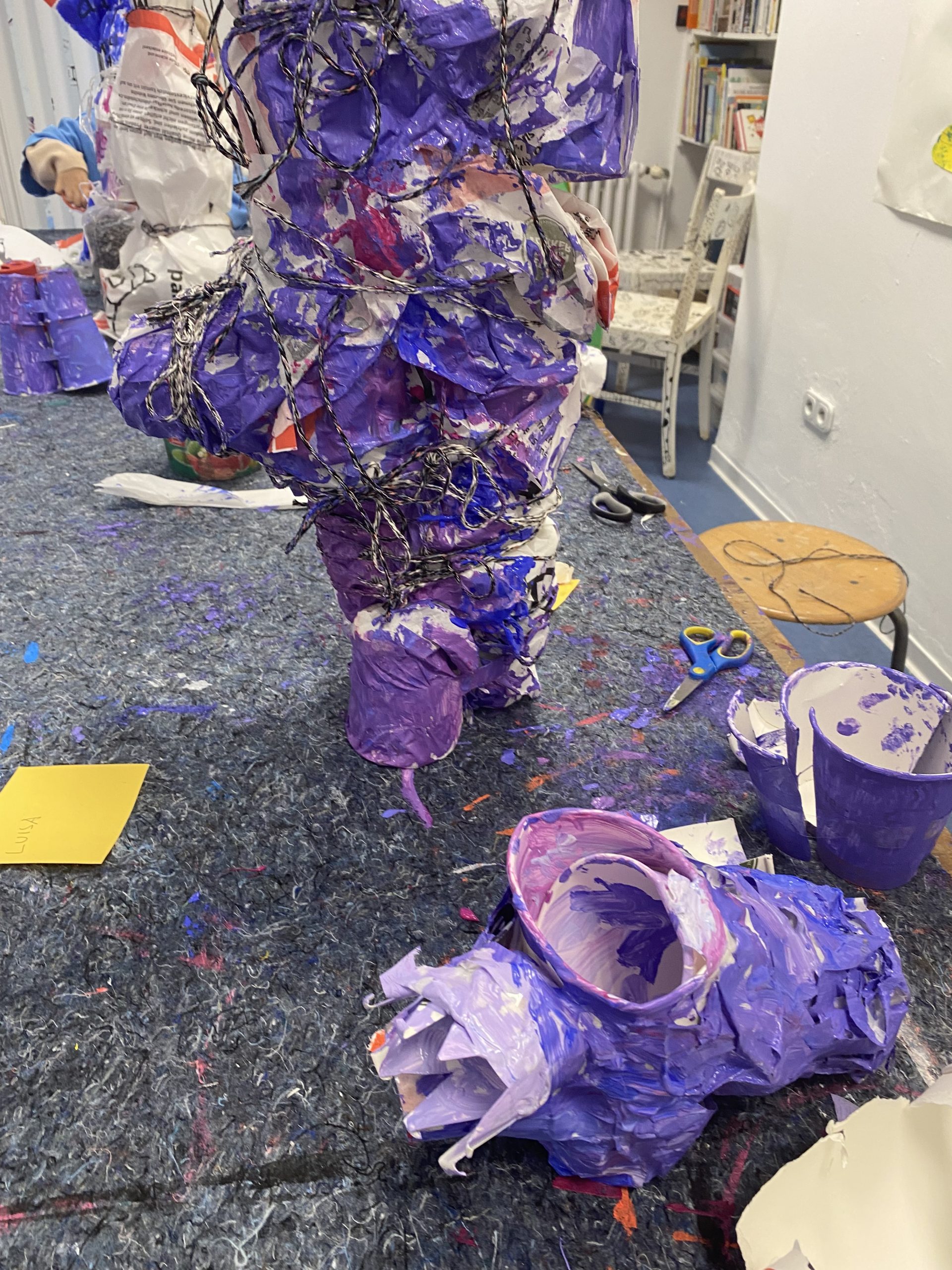 Wir bauen Skulpturen im Freien, die jeden Tag wachsen, versteckt oder offensichtlich, farbig oder schwarz-weiß, mit wenig oder viel, aus Holz, Draht, Pappmaché, Karton, Papier, Stoff und allem Material, das wir in unserem Atelier finden, an denen sich alle beteiligen, die alle unsere Ideen und Gedanken tragen. Ran an die Werkzeuge…