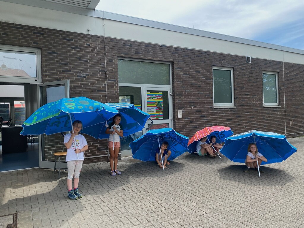 Der gegenüberliegende Park verwandelte sich dabei in einen Begegnungsraum: Erwachsene nutzten die Gelegenheit für Gespräche im Grünen, während die Kinder mit bunten Sonnenschirmen fantasievolle Zelte und Höhlen bauten. So entstand eine lebendige Mischung aus Atelieratmosphäre und Sommerfest.